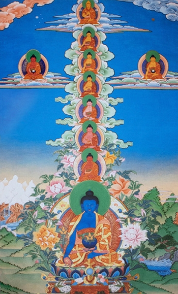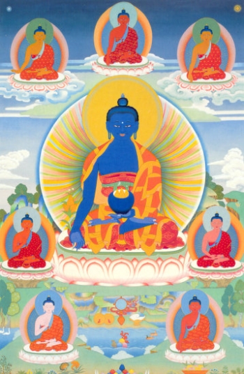 A somewhat later tradition, introduced to China in the early 8th century and eventually popular among Tibetans and Mongolians, focuses on 7 brothers identified as healing Buddhas, the senior physician among them being Bhaiṣajyaguru: