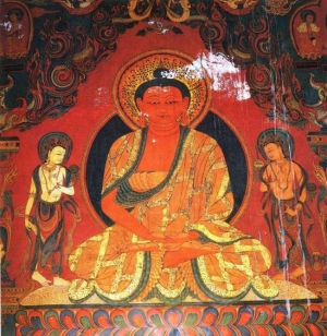 And the Buddha was accompanied by many of those magnificent human beings well advanced on their way to full awakening, those who are called Bodhisattvas or Maha-sattvas. For instance, the Bodhisattva Manjushri, the Prince of Dharma, was present in that assembly - and so was the Bodhisattva who is the Future Buddha of our age, the Bodhisattva Maitreya, who is called Invincible. And the Bodhisattvas Gandhahastin, Nityodyukta, and Anikshiptadhura were there. These and other, many more Bodhisattvas or maha-sattvas accompanied the Buddha at that time. Also present were Shakra, known also as Indra, the King of the Gods, and Brahma, Lord of this, our world, known as the Saha World. These and other heavenly beings - many hundreds of thousands of millions - accompanied the Buddha at that time.