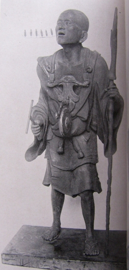 In fall of the 5th year [951], appealing for donations to both rich and poor, he called on Dharma companions to make a gold statue of Kannon approximately 3 meters in height, and a statue of Bon’ō (Brahma), Taishaku (Śakra Deva, Indra), and Shitennō (4 Heavenly Kings), each 6 shaku tall (about 178 centimetres):